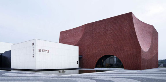 美術(shù)館的主體建筑由建筑大師、浙江大學(xué)建筑設(shè)計(jì)研究院院長(zhǎng)董丹申領(lǐng)銜設(shè)計(jì),設(shè)計(jì)理念從沭陽作為“中國(guó)書法之鄉(xiāng)”入手,以墨、紙、印的黑、白、紅作為建筑顏色元素,以中國(guó)書畫的虛實(shí)、輕重、疏密、開合、聚散等章法關(guān)系來布局建筑空間。